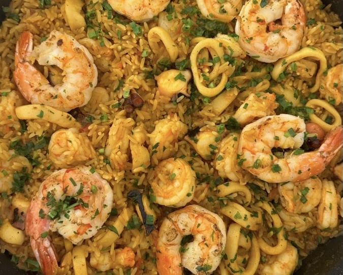 Camarón, calamar, langostinos, mejillónes, pulpo y almejas.